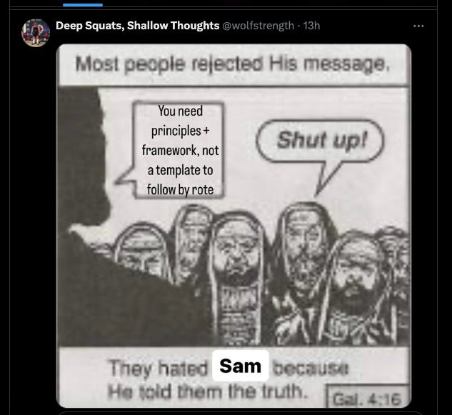 But that said, there is a downside to templates that, while not so bad as to be not worth doing at all, is a big issue in the industry that prevents people from reaching their full potential. And that simple issue is that most people will buy or read a template and try to implement it by rote, rather than learning and understanding the principles and frameworks that underlie it, and apply it with wisdom. This holds a lot of people back from training success and PRs, and also leads to endless “program hopping” wherein a lifter tries a program for a few weeks or a couple months at most, gets frustrated with his lack of progress, and then instead of problem solving and figuring out why it’s not working, just switches to the newest template from yet another Internet Fitness Influencer. Rinse and repeat the process multiple times per year.