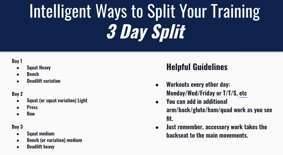 This is a standard 3-day template, though if you’re more time strapped this will be difficult to complete as doing 3 big lifts, 3 days a week will eventually mean 90 minute workouts or more. I have successfully used the same template with the following adjustment: Squat on Days 1 and 3 in a heavy/medium pattern, and only deadlift once a week on Day 2, alternating weeks for heavy and medium.