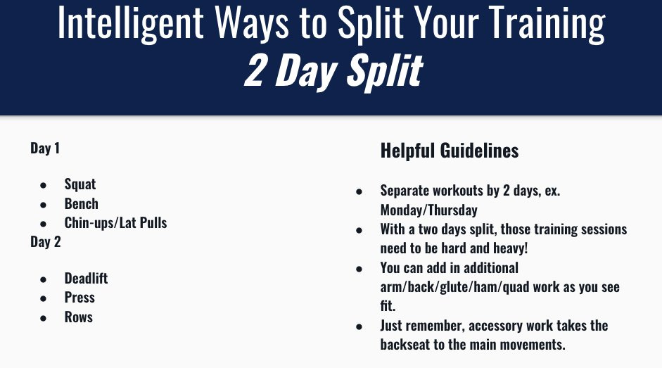 Here you have a very basic A/B style workout that you simply repeat weekly, with as much time between the days as your schedule allows, i.e. Mon/Thus or Tues/Fri. Since you’re only training twice a week, you need to make these sessions count - go hard and go heavy, push closer to the limit more than you would if you were training 3 or 4 days per week. You can add a bit of accessory work at the end, but prioritize the main work here. Accessories could be split upper one day and lower the other, or pick 1 or 2 each and do them each day.