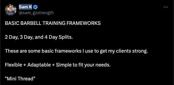 So that all said, let’s look at the frameworks for training that Sam put together. These are great frameworks for regular people to get excellent results with their strength training. Advanced lifters who want to push the limits on muscle mass and strength gains will need more intensive frameworks and possibly more individualized programming, but these are great for regular people who want real results.